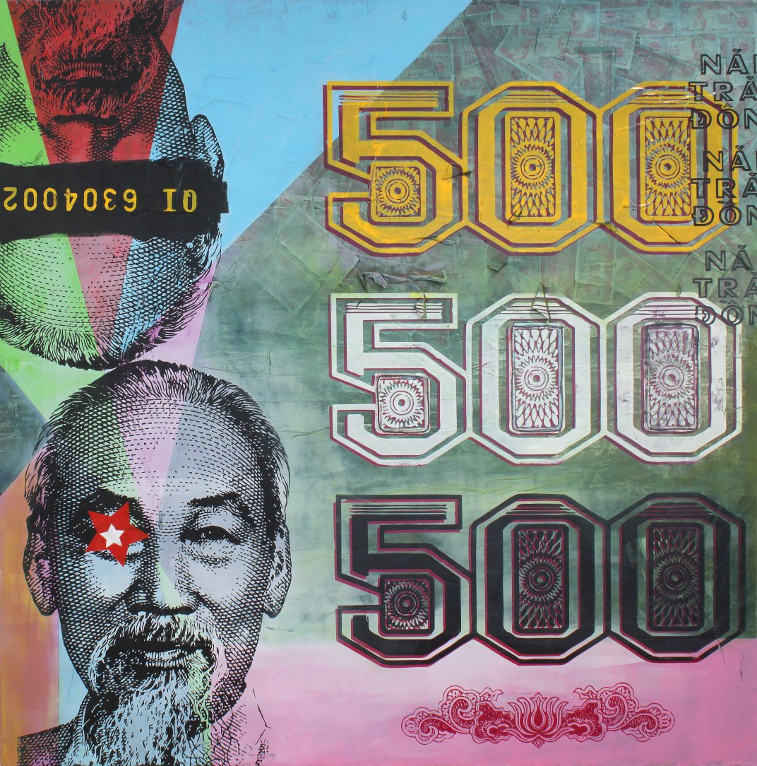 Painted on $50,000 worth of obsolete Vietnamese Dong, Brian Drake reflects on the