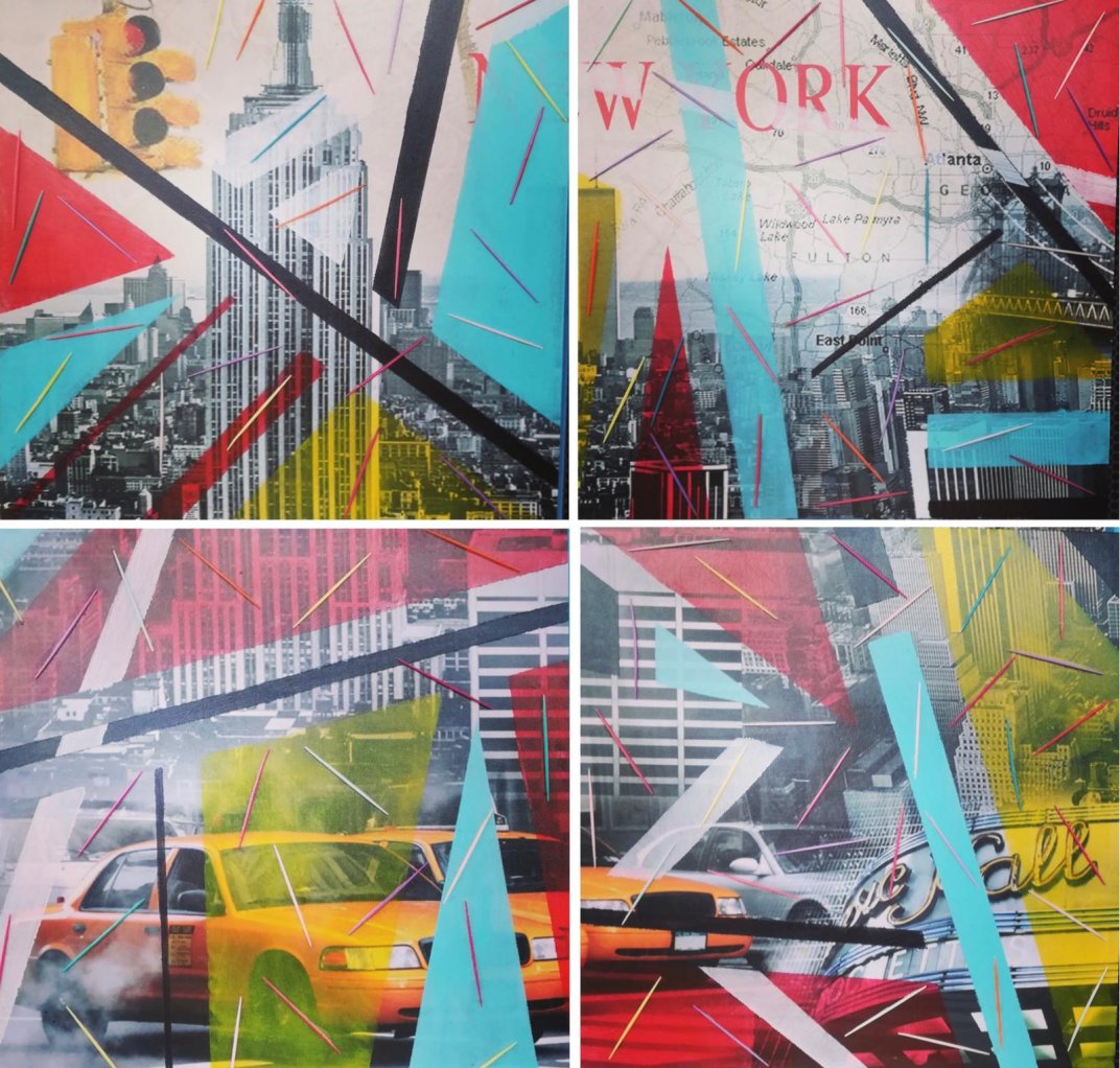 New York Semi - Zen 80 x 80 Polittico (cm 80 x 80) tecnica mista su tela. I lavori qui rappresentati appartengono ad un ciclo pittorico titolato Semi- Zen. L’associazione del temine Semi al termine Zen indica una vicinanza ma nello stesso tempo una presa di distanza da questa disciplina dello spirito. Semi sta per l’appunto a significare un approccio ironico e giocoso al fare artistico. Il termine Zen intende perseguire una rappresentazione della realtà ridotta all’essenzialità, ad assiomi estetici primari. I primi lavori dedicati a tale ciclo si esprimevano attraverso superfici monocromatiche in cui prevale la disposizione casuale degli elementi posticci (stuzzicadenti di plastica).In questi ultimi lavori l’elemento figurativo (pre-costituito) funge da superficie su cui fare coesistere gli elementi eterogenei ( stuzzicadenti colorati)alla luce di un’intenzione che rivisita e reinterpreta l’immagine convenzionale (ovvero il già dato) attraverso le categorie primarie di significazione. All’uopo sono stati utilizzate tele stampate raffiguranti piazze, monumenti, agglomerati urbani,mappe topografiche.