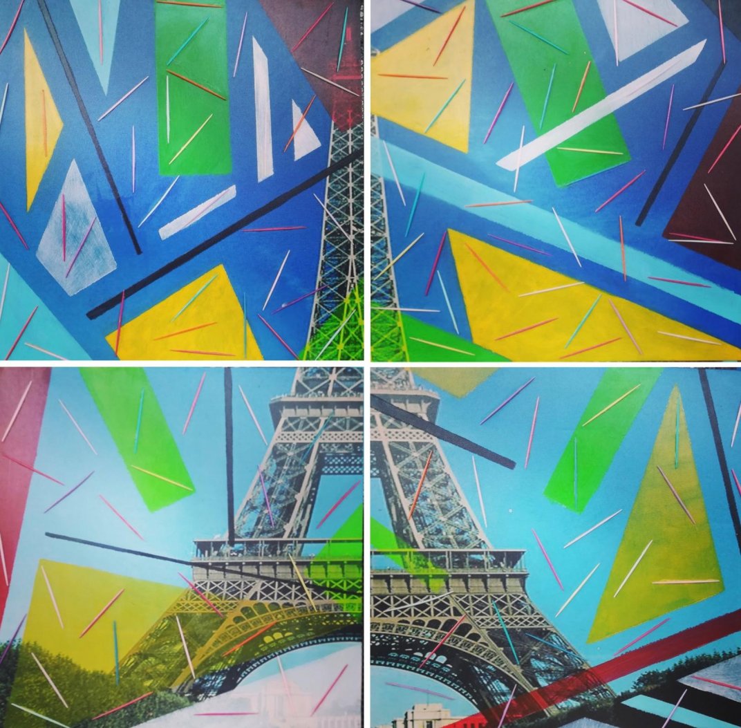 Paris - Semi Zen 80 x80 Polittico (cm 80 x 80) Tecnica mista su tela. I lavori qui rappresentati appartengono ad un ciclo pittorico titolato Semi- Zen. L’associazione del temine Semi al termine Zen indica una vicinanza ma nello stesso tempo una presa di distanza da questa disciplina dello spirito. Semi sta per l’appunto a significare un approccio ironico e giocoso al fare artistico. Il termine Zen intende perseguire una rappresentazione della realtà ridotta all’essenzialità, ad assiomi estetici primari. I primi lavori dedicati a tale ciclo si esprimevano attraverso superfici monocromatiche in cui prevale la disposizione casuale degli elementi posticci (stuzzicadenti di plastica).In questi ultimi lavori l’elemento figurativo (pre-costituito) funge da superficie su cui fare coesistere gli elementi eterogenei ( stuzzicadenti colorati)alla luce di un’intenzione che rivisita e reinterpreta l’immagine convenzionale (ovvero il già dato) attraverso le categorie primarie di significazione. All’uopo sono stati utilizzate tele stampate raffiguranti piazze, monumenti, agglomerati urbani,mappe topografiche.