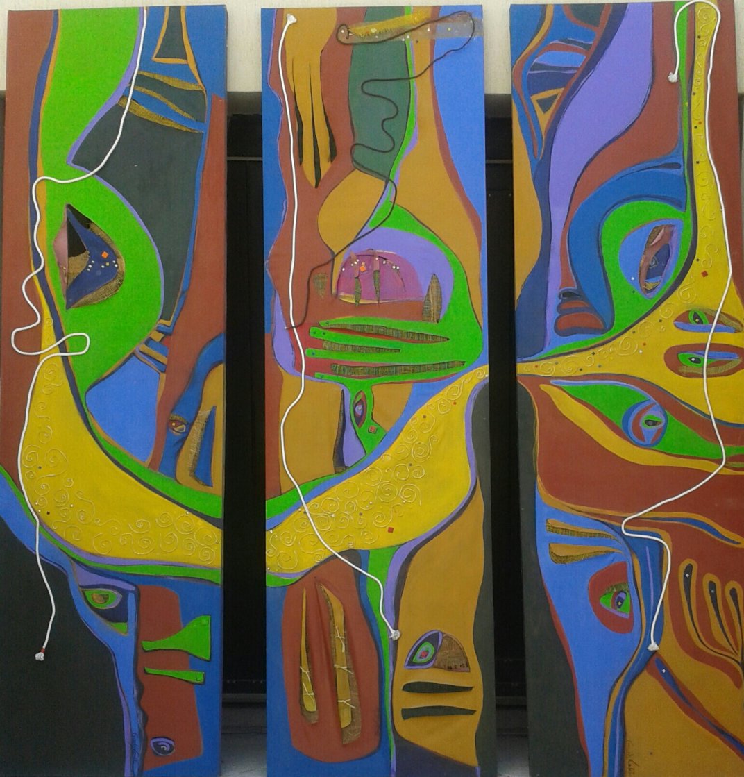 My work is made on three large separate panels, each in size 1 x 3 meters.Beads, robes, different materials are glued, cut and adjusted in each individual frame and when assembled all together, they represent a contemporary interpretation of the bright and colourful Maltese Luzzu