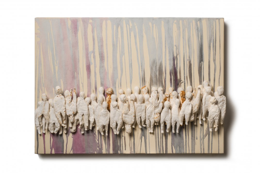Morphologically, Multiple transitions, is made up of a group of figures representing people, some still, some walking, some waiting and some standing upside down in a misty place. It´s made with molded cotton fiber, with reused water as a way ecologicaly of producing paper.
