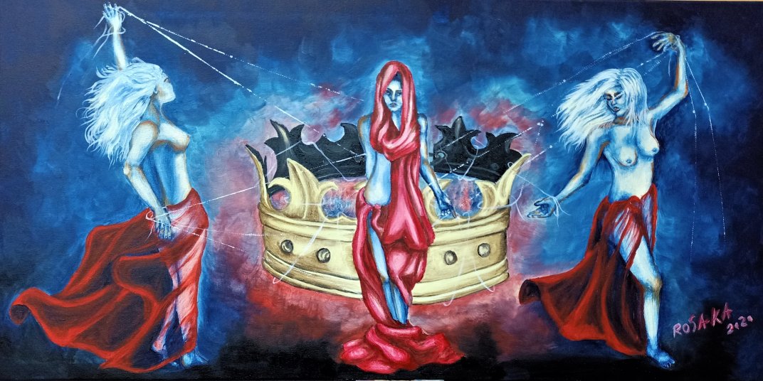 LE SORELLE FATALI E LA SCONFITTA DI MACHBETH - acrilico su tela 80*40-anno 2020