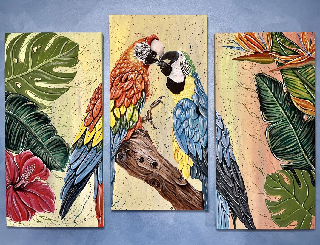 Trittico Acrilico su tela, 2021 Dimensioni: 120 cm x 60 cm (ognuna) Totale : 130,5 cm ( l’altezza, per via della tela centrale più rialzata) x 190 cm ( larghezza, per via dello spazio tra le due tele laterali, da quella centrale, di 5 cm ciascuna.) Opera ispirata ad una frase di Paulo Coelho : “ Nel mondo esiste sempre qualcuno che attende qualcun altro, che ci si trovi in un deserto o in una grande città. E quando questi due esseri si incontrano, e i loro sguardi si incrociano, tutto il passato e tutto il futuro non hanno più alcuna importanza. Esistono solo quel momento e quella straordinaria certezza che tutte le cose sotto il sole sono state scritte dalla stessa Mano: la Mano che risveglia l’Amore e che ha creato un’anima gemella per chiunque lavori, si riposi e cerchi i propri tesori sotto il sole.” La diversità di specie tra i due pappagalli, è scelta appositamente per accentuare un sentimento che non ha razza, colore, tempo e spazio, ma una cosa in comune... l’amore reciproco tra due esseri che si uniscono in uno!