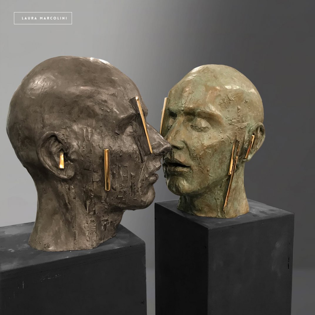 Teste gemelle in bronzo policromo ed inserti lucidi.
