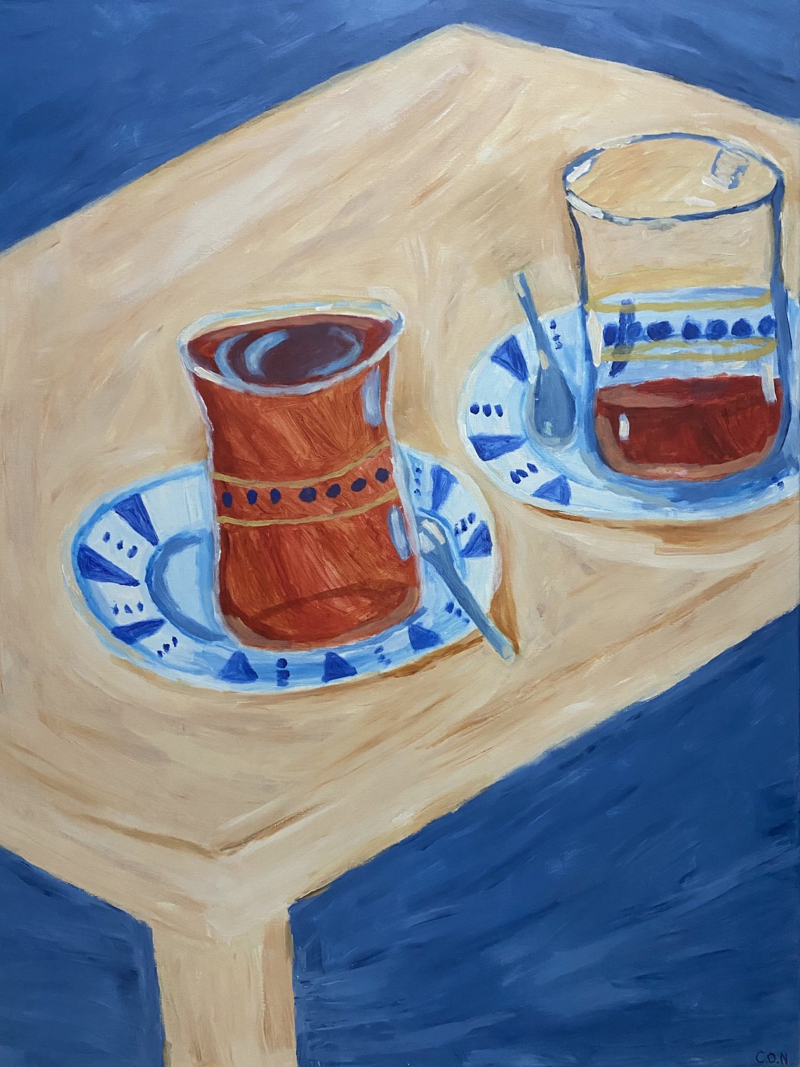The painting reflects the perpsectives of optimism using tea. The full tea cup represents opmtimism while the half empty cup represents pessimistic.