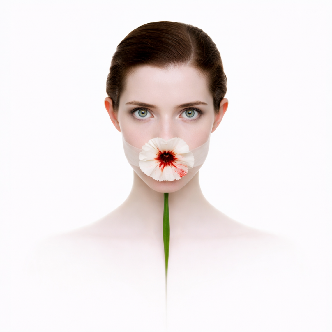 AI-assisted digital artwork, digital post-processing A silent portrait where nature replaces speech. The flower becomes both seal and wound, suggesting the fragile boundary between beauty and restraint. The work explores silence not as absence, but as a suspended moment where vulnerability and resistance coexist.