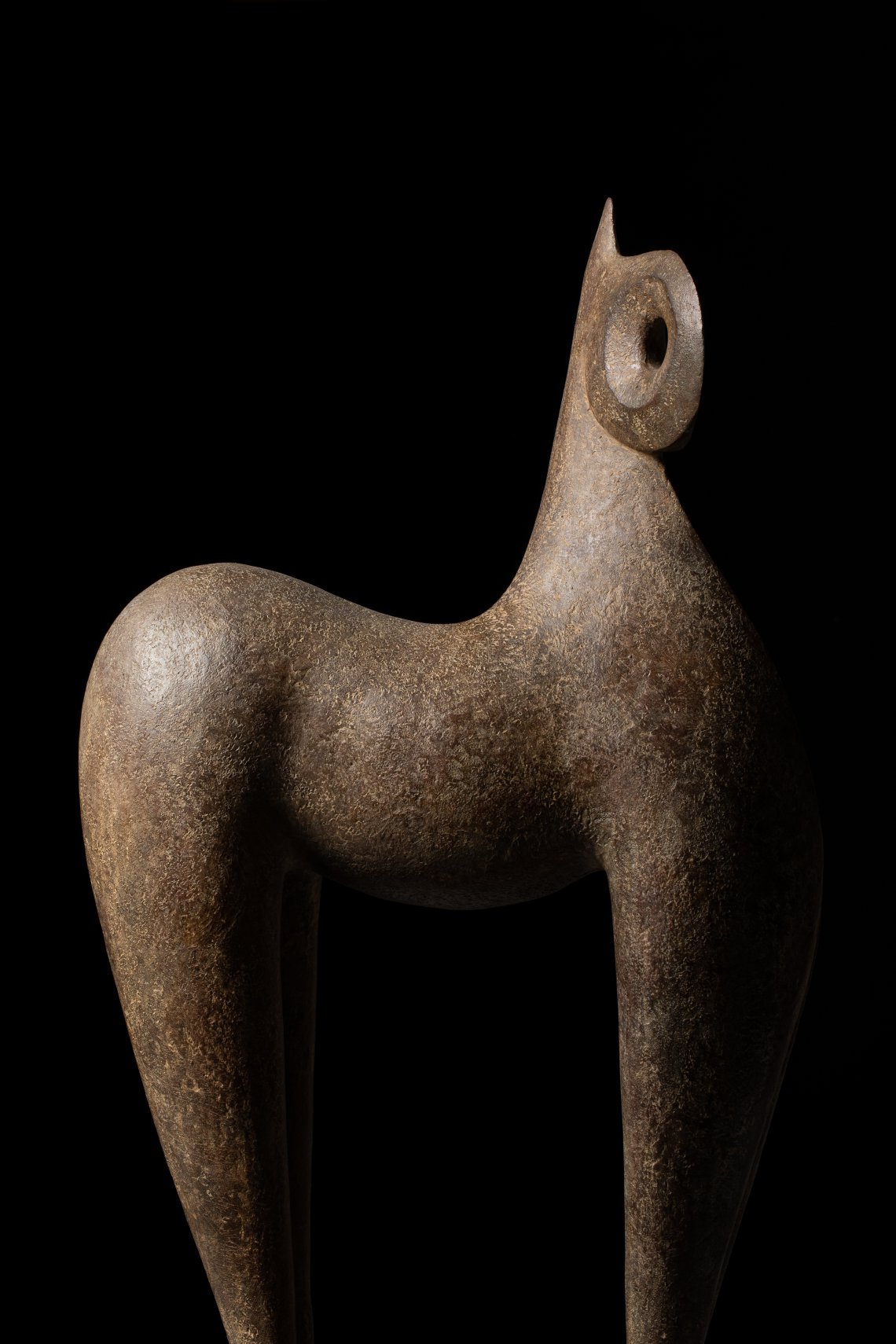 Scultura in bronzo, Ispirata dai talismani equestri utilizzati dal popolo guerriero Kotoko, che viveva attorno alle antiche acque del Lago Ciad, il cavallo di Manzon prende forma attraverso stilizzazioni quasi astratte. Linee levigate ed essenziali sussurrano forza e grazia, distillando l’essenza dell’animale in un simbolo senza tempo.