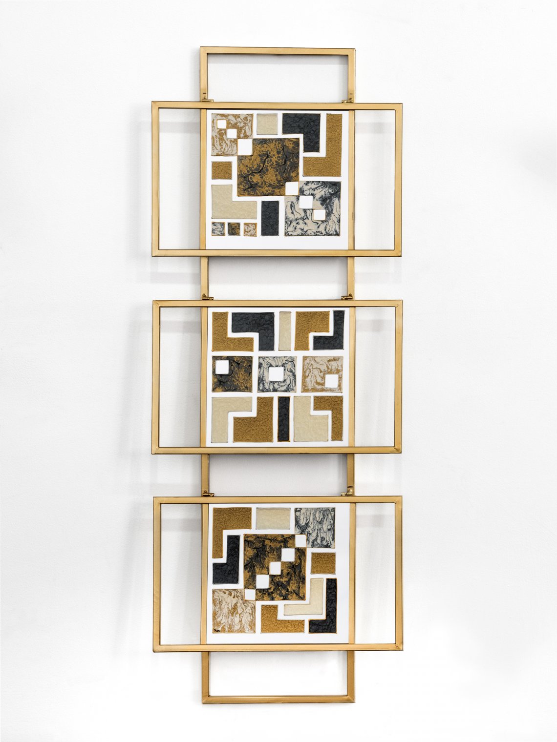 "Smoke & mirrors" explores the tension between reflection and opacity, order and fragmentation. Painted directly on mirror surfaces using relief outliners and glass paints, the work reveals shifting geometric compositions where exposed mirror fragments interrupt the painted fields. The triptych structure and metallic hues echo architectural rhythm while inviting the viewer’s own image into the work — blurring the boundary between observer and object. Through this interplay of surface and depth, the piece reflects on perception as both a constructed and dissolving experience.
