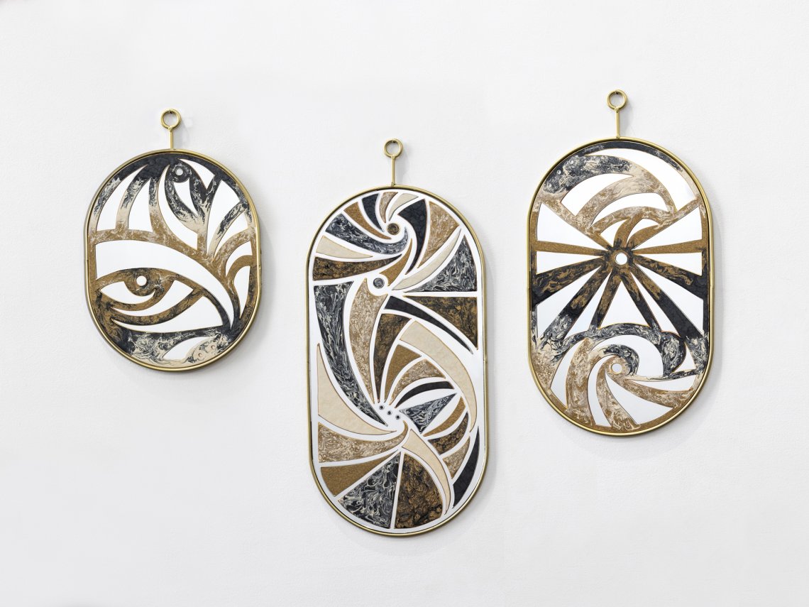 "The fourth wall" is a triptych of painted mirrors that blurs the boundary between image and observer. Painted with relief outliners and glass paints, the three panels share a common visual rhythm — a dialogue of curves, geometric shapes, and reflective segments that shift between presence and absence. Across the composition, forms alternate between being defined by color and by its removal, as painted surfaces give way to exposed mirror. This play of positive and negative space creates a continuous flow between the panels, uniting them in a single, unfolding motion. Alluding to the theatrical “fourth wall,” the work invites viewers to recognize their reflection within the abstract geometry, becoming both audience and participant in a scene that dissolves the distance between seeing and being seen.