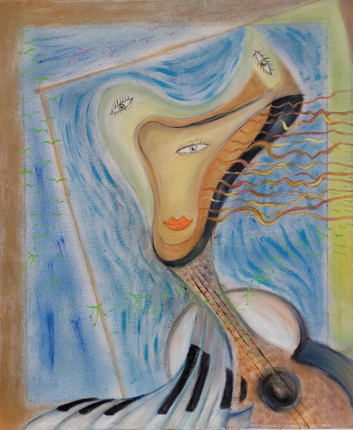 Il corpo non si chiude in una forma definita, ma si estende nello spazio attraverso strumenti musicali che costituiscono il corpo stesso: come se il desiderio si suonasse. I capelli della figura, lunghi e fluttuanti, si dispiegano come un pentagramma vivente, attraversati da note musicali che prendono il volo. Le note si staccano dalla partitura e si trasformano progressivamente in uccelli che si librano verso l’alto, verso un cielo che non si vede, ma si intuisce. Intorno alla figura fluttuano finestre, simboli antichi e moderni della separazione tra interno ed esterno, tra prima e il dopo, separati da un vetro di invisibile presente. Tutto è in movimento, tutto tende verso l’Altro. Nulla è chiuso.