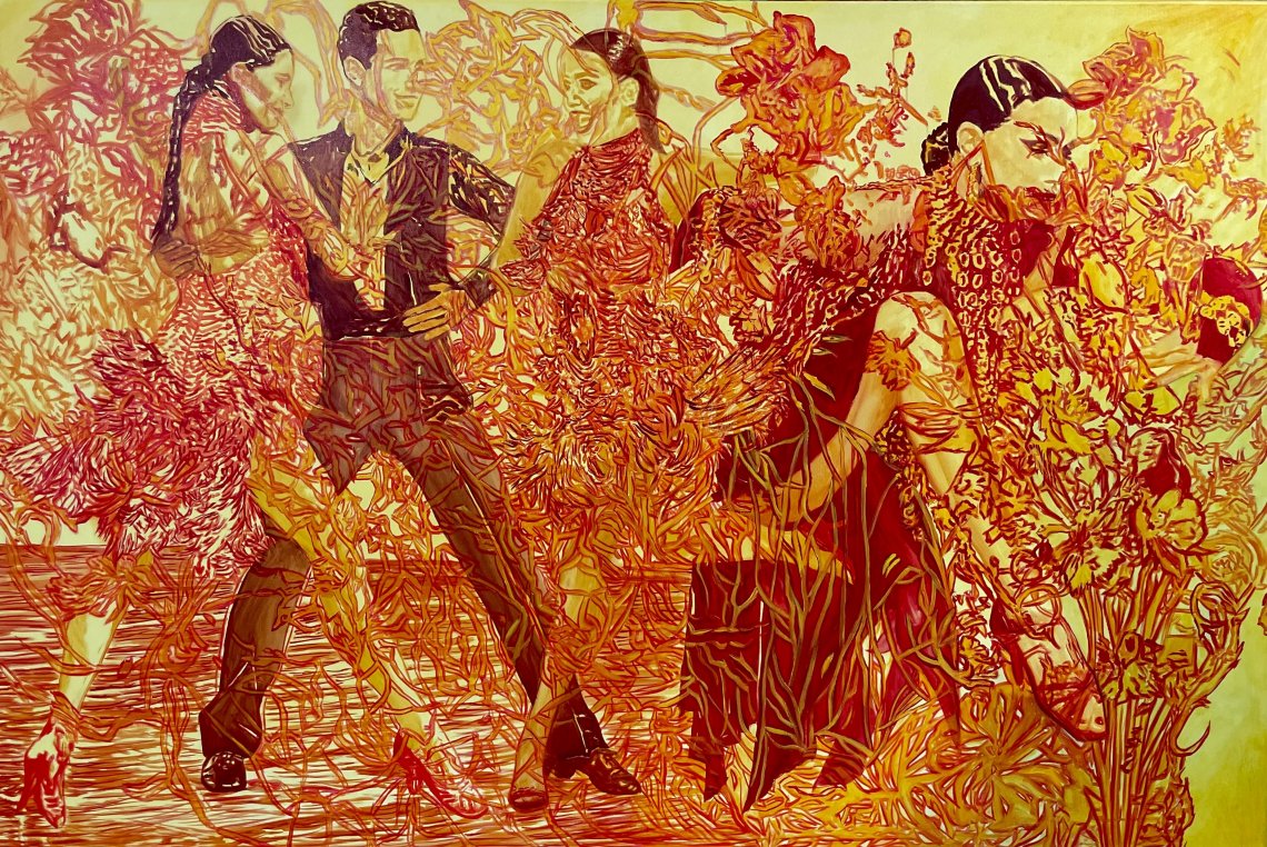 "PASSION I" explores the raw intensity of human emotion expressed through movement and the physical presence of the body. The figures, caught in a moment of dance, become a metaphor for inner tension, desire, and emotional surrender. Through expressive brushwork and a vibrant palette dominated by warm reds and luminous yellows, the painting captures the fragile balance between control and spontaneity.