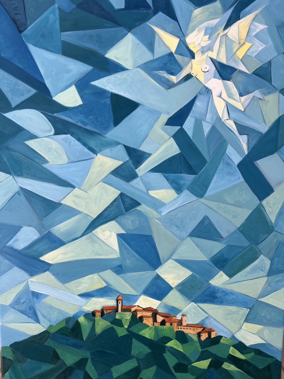 Oil on canvas, 40” × 30” A luminous angel emerges from a fractured sky of crystalline blues, hovering protectively above the rolling green hills of Grosseto. Rendered in a contemporary Cubist language, the figure is formed from sharp geometric planes that dissolve into the atmosphere, suggesting both movement and divinity. Below, the warm terracotta rooftops anchor the composition in earthly reality, while the vast, faceted sky evokes spiritual transcendence. The painting becomes a dialogue between heaven and land — a guardian presence watching over memory, place, and home.