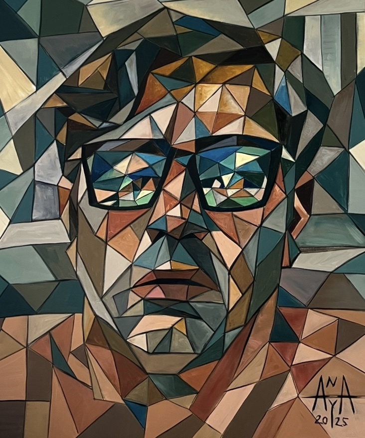 Oil on canvas 60” x 72” Description He looks away, yet does not withdraw. Amante is a silent presence—emotion held back, analyzed, fragmented. Cooler tones suggest distance and introspection. The eyeglasses reflect an inner world, or perhaps shield something unspoken. His face, built from sharp angles and shadows, hints at desire not fully revealed. This painting doesn’t offer answers—it asks how we see and relate to those we love.