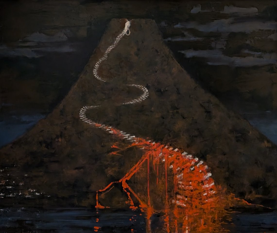 Zip-Vulcano: Il Collasso della Protezione Nota dell'opera: "Zip-Vulcano" mette in scena il momento esatto in cui il patto di fiducia tra l'uomo e la terra si spezza. La cerniera non è un fregio, ma l’ultimo, fragilissimo confine tra la civiltà e l'annichilimento. Le luci del paesino notturno incarnano la psicologia della sicurezza: l'ostinata convinzione umana di poter abitare l'abisso restandone immuni. L'Anomalia esplode nel cedimento dello zig-zag metallico: la fuoriuscita della lava non è solo un evento chimico-fisico, ma la violazione definitiva di quel confine. In questo scontro tra la volontà di contenere e l'imprevedibilità della forza elementale, la caducità della vita si rivela nel fallimento di una protezione che smette di tenere. Chi guarda non assiste a un paesaggio, ma al naufragio di un'illusione.