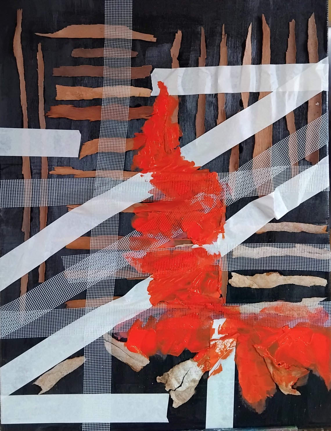 The work is built from a structured grid of eucalyptus bark applied to a dark surface. Paper tapes create diagonal interventions that cross and partially cover the grid, while transparent plastic mesh elements evoke the idea of a protective layer. At the center, a vivid red pigment spreads vertically across the surface, suggesting an open wound that breaks and alters the initial order of the composition. The work explores the tension between natural materials and artificial interventions, where structure, rupture, and repair coexist.