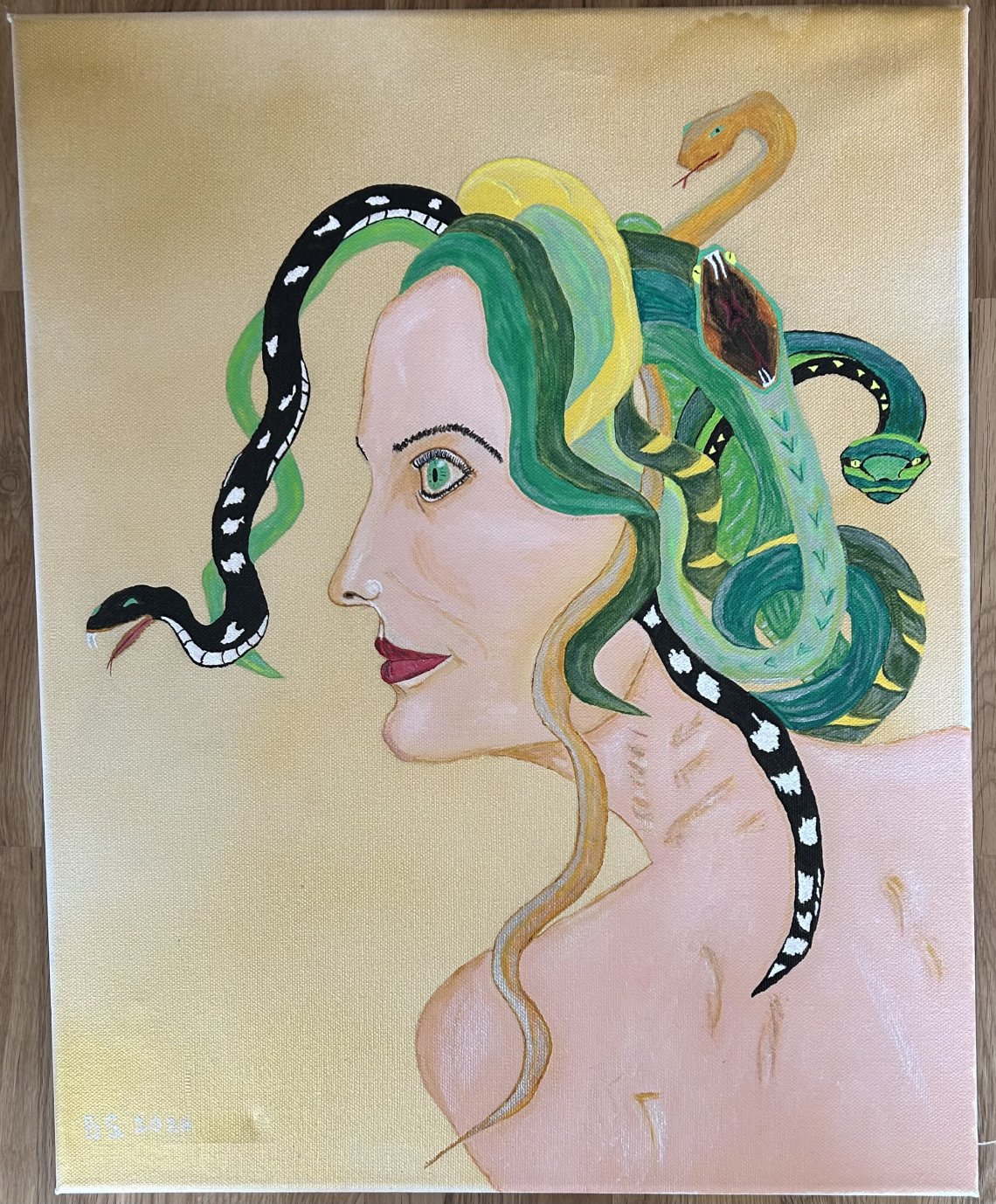 Medusa nicht als Opfer sondern als Symbol für Macht, Schutz und Transformation. Ihr abgewandter Blick erinnert an die stille Präsenz ihrer Kraft, die jederzeit voll erwachen kann. Die Schlangen, wachsam und lebendig, bewachen und bewahren dieses uralte Geheimnis der Transformation von Fluch und Dunkelheit in Macht und Würde.