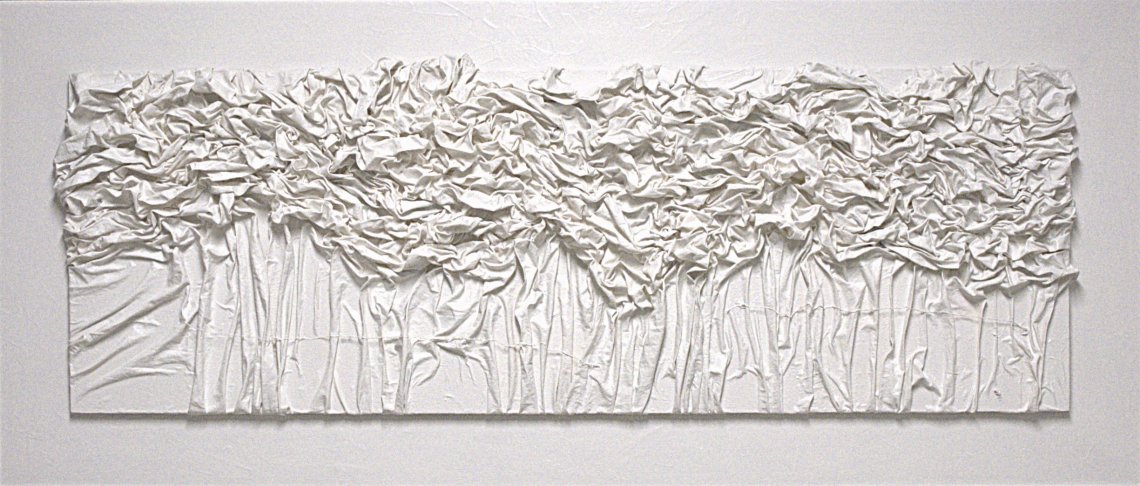 FILOBIANCO (40X120 senza cornice) è un'opera d'arte mista nata da lenzuola di cotone di recupero, modellate con una miscela materica di colla, gesso e stucco. Il tessuto è modellato su un pannello di legno, seguendo le forme degli alberi e le pieghe naturali del materiale. Una volta asciutta, la superficie viene stratificata con smalto bianco, creando una pelle luminosa e tattile. Un delicato filo bianco si estende attraverso il dipinto, invitando l'osservatore a un'esplorazione serena e spirituale.
