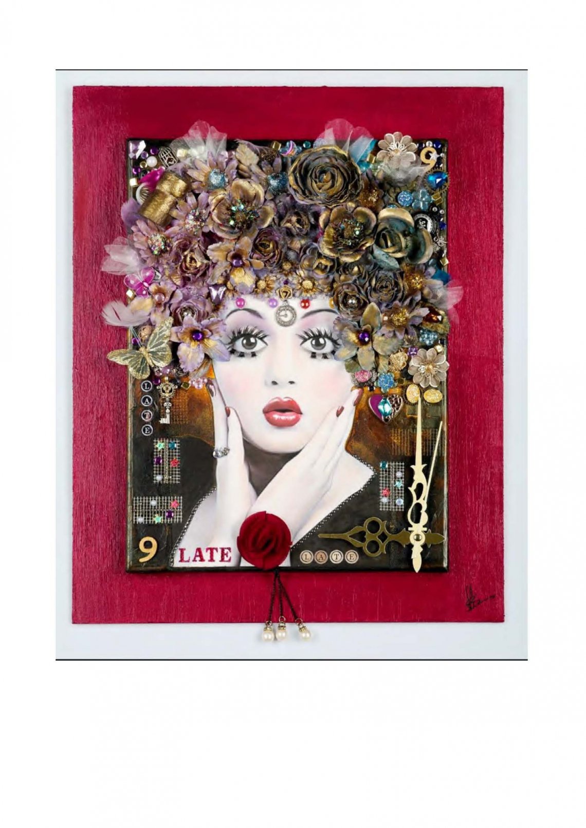 Mixed Media, fiori trattati con gesso e dipinti con acrilico da sx a dx (dal viola chiaro al blu notte), inserimento di strass colorati e gioielli vari. Aggiunta di elementi decorativi vari che indicano le ore 9 del mattino. Misure 30x40, misura totale 40x50