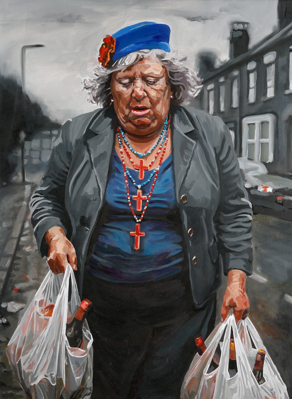 La composizione frontale e priva di elementi decorativi concentra l’attenzione sulla figura, il cui sguardo abbassato e la postura segnata raccontano una fatica esistenziale più che una sconfitta. Le croci sul petto ricorrono come simboli ambivalenti di identità, memoria e peso culturale.