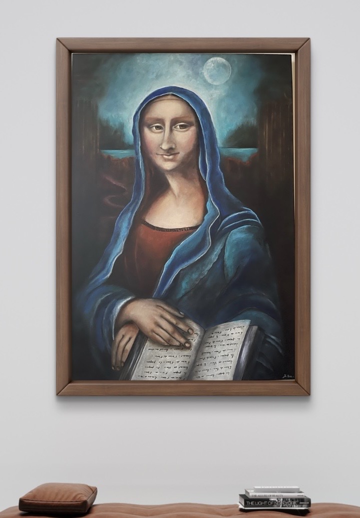 J’ai choisi de nommer ce tableau La Gardienne du Temps. Pour moi, elle incarne un hommage à l’histoire de l’art et à Léonard de Vinci, tout en portant ma propre vision. Peinte à ma manière, cette œuvre devient un témoin intemporel — une gardienne qui traverse les époques et laisse son empreinte dans l’histoire. Chaque détail, chaque nuance, est une invitation à contempler le passage du temps, la mémoire des œuvres et la poésie du regard. Cette peinture est née de mes émotions, de mes inspirations et de mon besoin de créer un lien entre passé et présent, rêve et réalité. Acrylique. Châssis sur toile de lin . 77x53