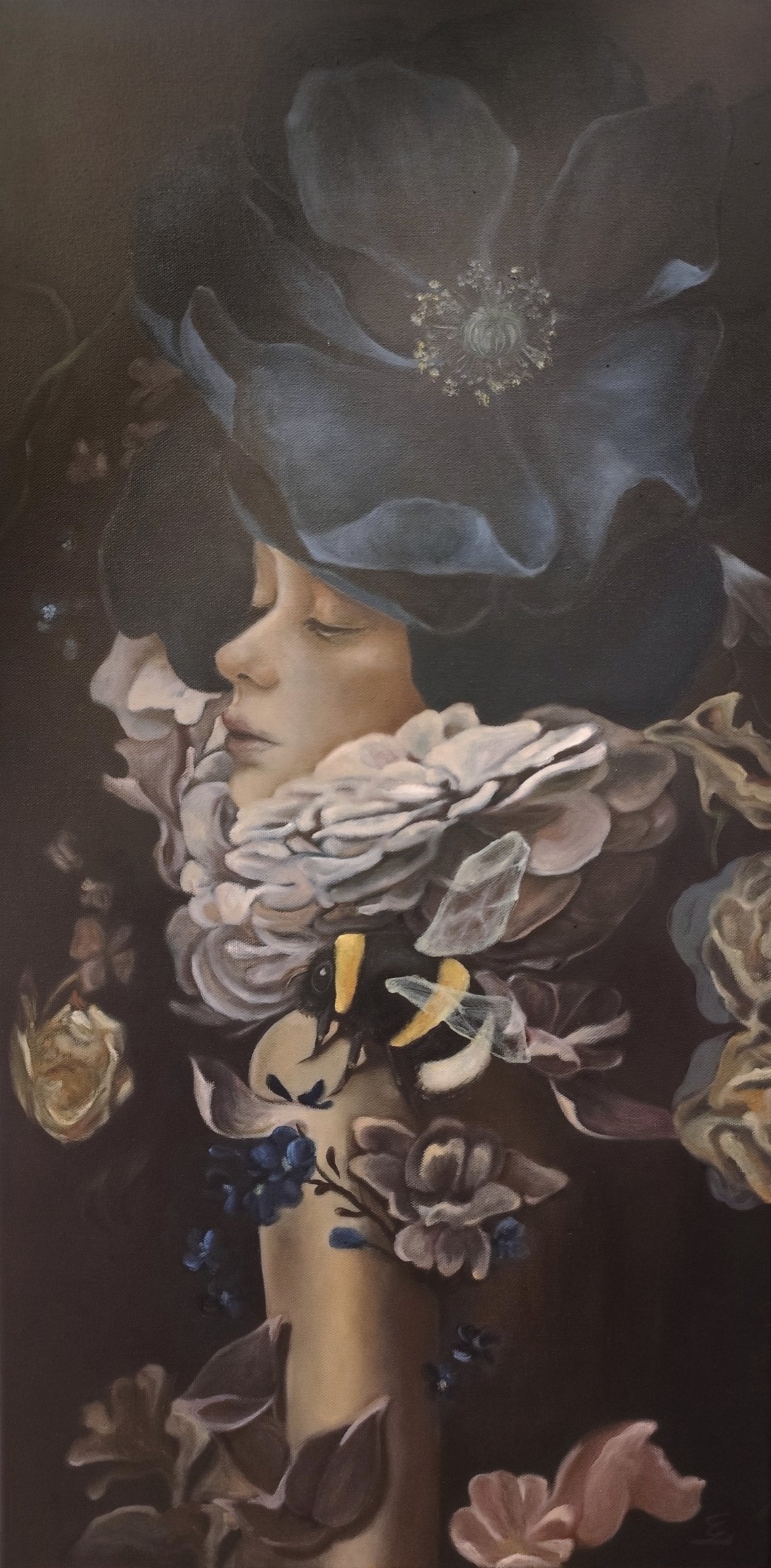 Dal velo nero della notte, emerge un volto addormentato, onirico e malinconico, coronato e circondato da fiori di velluto scuro. Non è un sogno, ma un abbraccio di fiori che sembrano appartenere a un giardino segreto. Una bellezza che è al tempo stesso ricca e decadente. E in quel fragile silenzio, l'ape gialla e nera è un sigillo di vita, un punto d'oro che mormora: "Anche nel sonno profondo, la dolce, selvaggia essenza del mondo danza e attende il risveglio."
