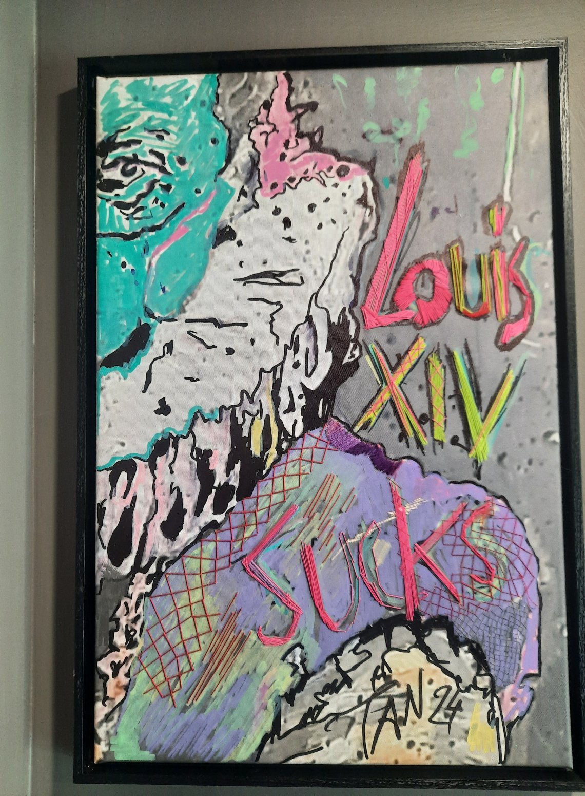 “Louis XVI Sucks” is a satirical mixed-media work that merges painting and textile interventions to question the persistence of power structures and the narratives we inherit about them. By deliberately combining vibrant acrylic layers with raw, hand-stitched text elements, the piece contrasts historical grandeur with contemporary irreverence.