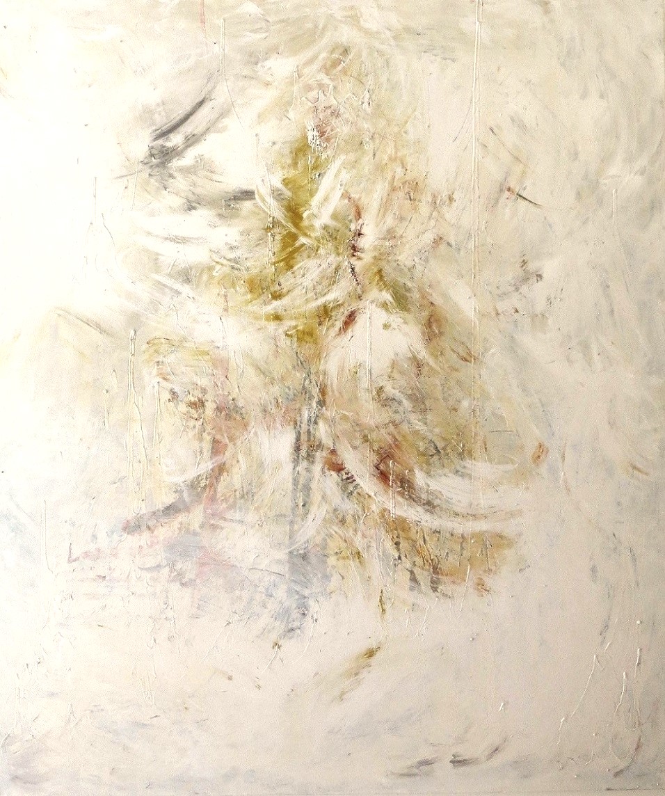 In Series II N°1, Christel Blockeel develops a highly nuanced abstract vocabulary in which luminosity, gesture, and material delicacy coalesce into a composition of remarkable subtlety and emotional resonance. The work unfolds across an expansive, almost atmospheric white ground, where translucent layers, fluid brushwork, and faint chromatic accretions emerge and recede with an almost immaterial presence. Rather than asserting itself through density or formal containment, the painting operates through diffusion, suspension, and the quiet accumulation of traces.