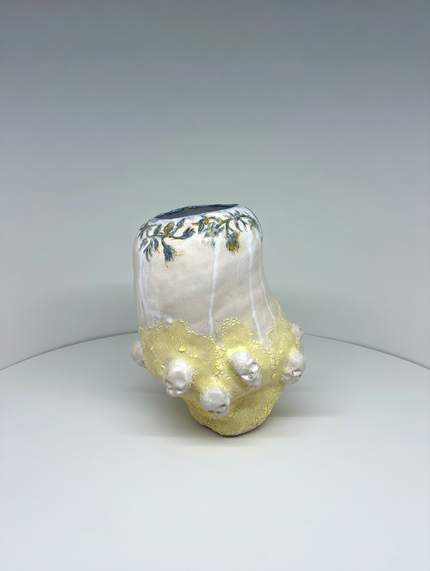 Le escrescenze non sono germogli: sono teschi, presenze minimali e ripetitive che emergono dalla materia come una silenziosa proliferazione. Non decorazione, ma ricordo. La bellezza qui è già contaminata dalla sua conseguenza.