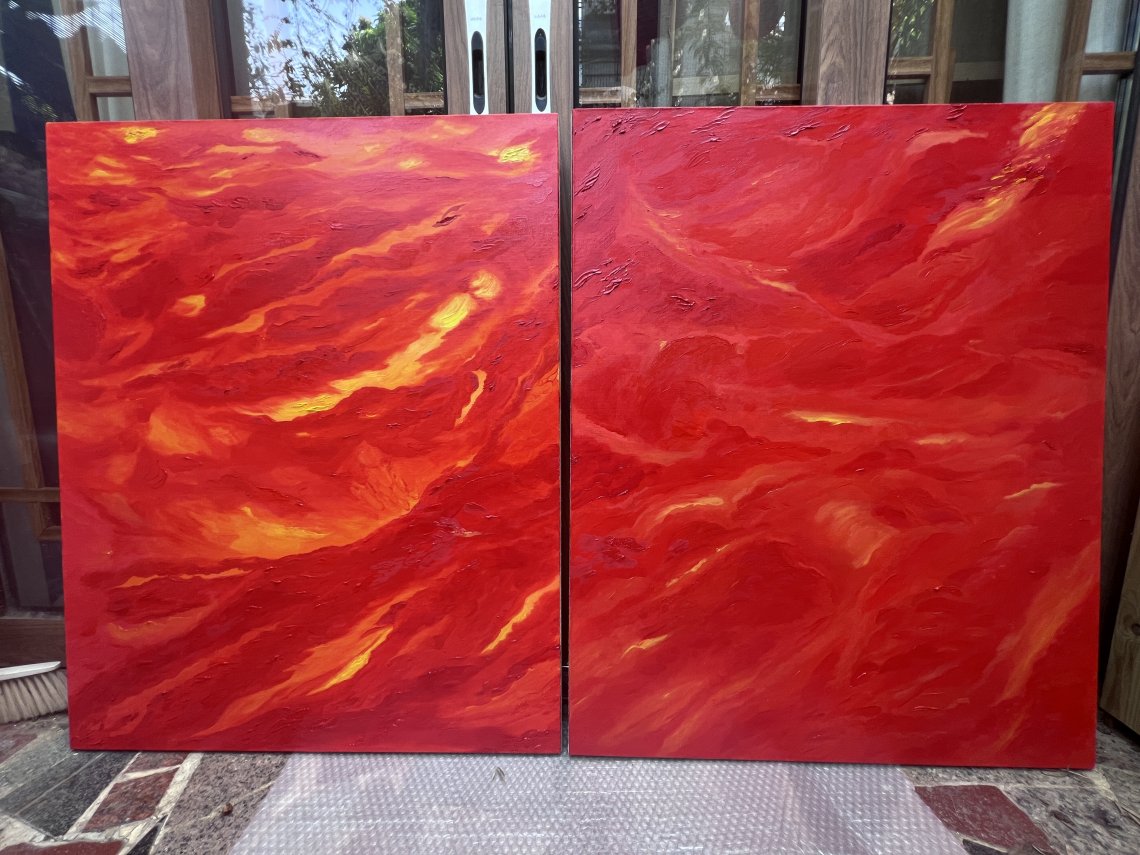 The inspiration for this oil painting stems from a relentless longing for Truth and the pursuit of it. In the eyes of the creator, Truth never reveals itself lightly. It is tightly wrapped beneath layer upon layer of hypocrisy, pretense, and illusion, like a pearl sealed in a dark core. It must endure the repeated searing of volcanic flames – a fierce, incandescent, and merciless flame that incinerates all vanity and pretence. Only from the remaining embers is a crystalline essence slowly and painfully forged. The molten lame is no tepid simmer; it carries the weight of the wrath of celestial thunder – a profound indignation against all that is false, illusory, and contrived. This wrath shatters the silence and consumes the lies, until, from the canvas’s profoundest depths, the resolute light of Truth bursts forth. A deafening roar proclaims that only pure Truth can illuminate the world. The flames of Thunderfire sit in judgment of injustice and herald the advent of peace.