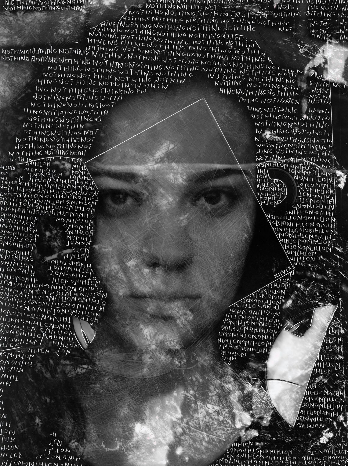 The work Nothing is part of the photogram series titled Whispers, created through a combination of digital and analog photography. In addition to the depicted portraits, an integral element of the series consists of words engraved onto the surface of the photographs. To create them, I used various tools such as knives, nails, and wires. Each word is carefully chosen and positioned to resonate with the image, forming a distinctive symbiosis between text and artistic vision.