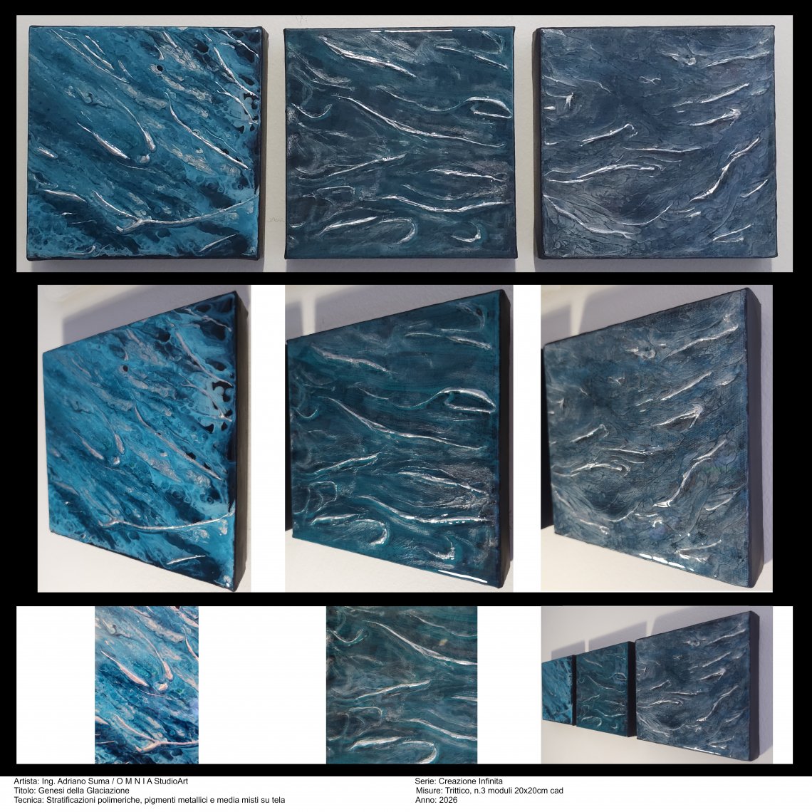 "Genesi della Glaciazione" è un’indagine visiva sul passaggio di stato della materia primordiale. Attraverso la stratificazione di resine vitree e l’affioramento di creste d'argento, l'opera cristallizza il momento esatto in cui il caos fluido si trasforma in struttura solida. Un trittico concepito come un frammento di un evento cosmico, dove la tecnica della sottrazione alcolica e del pouring crea un paesaggio molecolare inaccessibile. L'opera esplora l’avanzata del gelo attraverso tre diverse dinamiche pittoriche e si sviluppa su una struttura materica in pasta modellante.