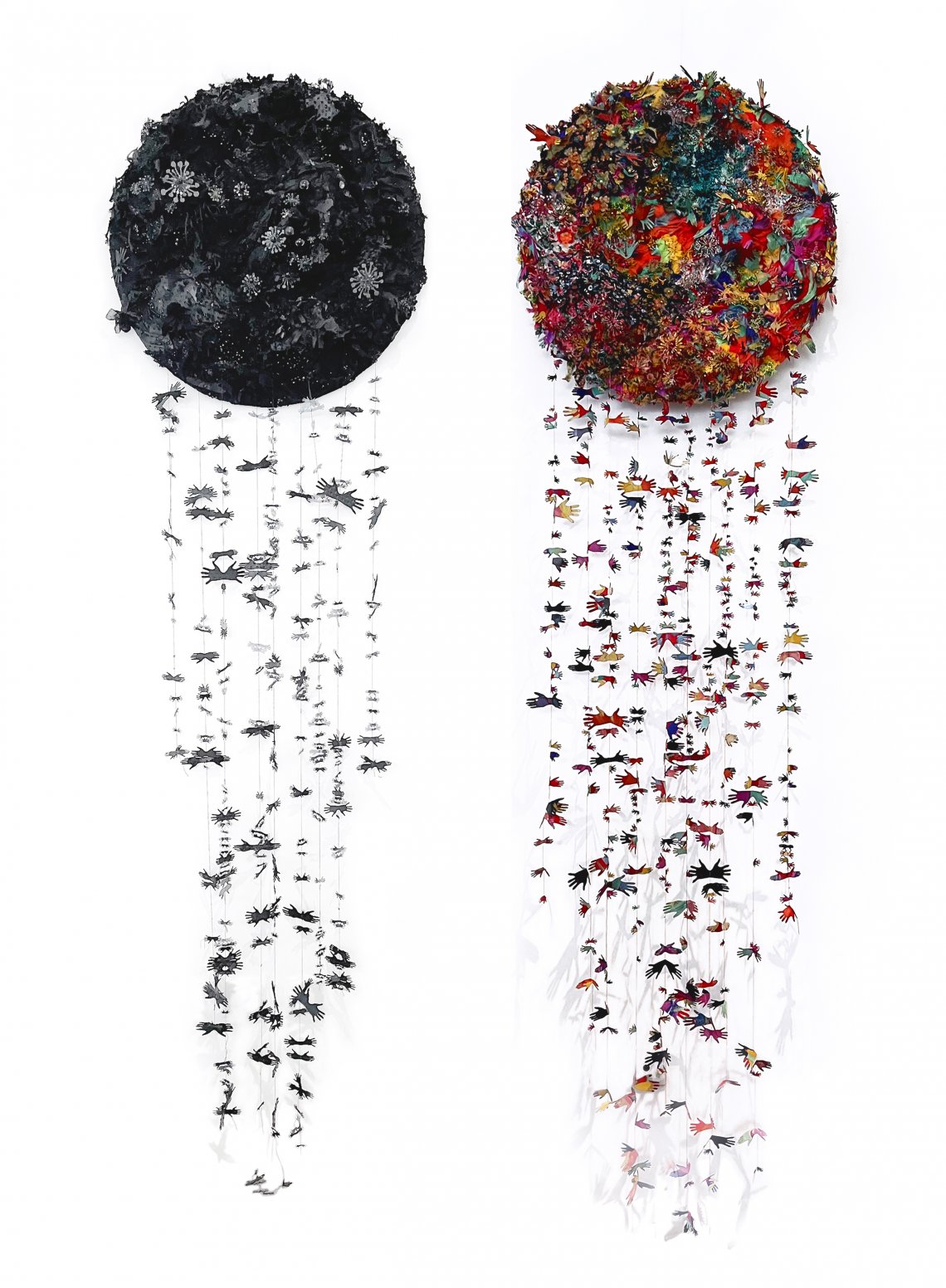 From each circle, hands fall, held by threads—precarious links of continuity between maintenance and collapse.