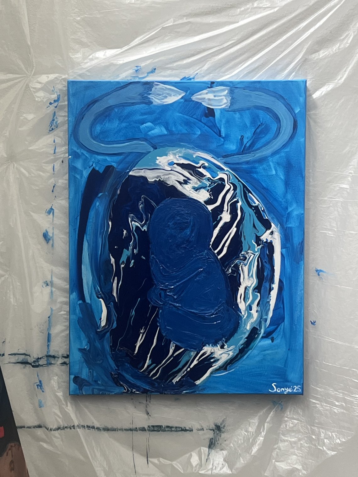 Description This piece explores the origin of life through the lens of fluidity, protection, and transformation. At its center, a developing form rests within a womb-like sphere, suspended in motion and surrounded by currents of blue—symbolizing water, emotion, and the subconscious. The layered tones of blue represent depth: the internal world, the unknown, and the continuous flow of becoming. The circular form evokes both the planet and the womb, suggesting a connection between creation on a personal level and creation on a universal scale. The sweeping gestures above the form mirror both protection and tension—like unseen forces shaping existence. Inspired by the philosophy of being “formless like water,” the painting reflects the idea that growth requires adaptability, surrender, and trust in the process. This work captures a moment between stillness and motion—where life is not yet fully realized, but everything it needs to become already exists. — Sonyé