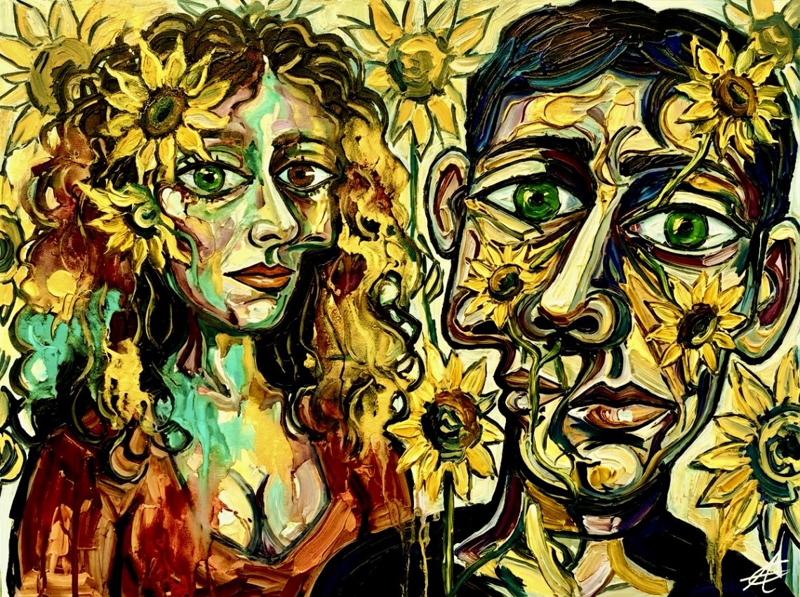 A vivid and emotionally charged composition depicting two figures immersed in a surreal, sunflower-filled environment. Inspired by cubist distortion and expressionist intensity, the faces are fragmented and layered with flowing, almost melting colors, suggesting emotional overflow and inner transformation. The repeated presence of sunflowers—both surrounding and growing from the figures—symbolizes vitality, resilience, and the persistence of light even within psychological complexity.