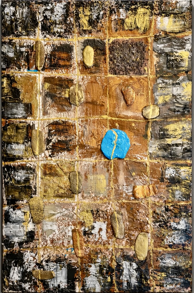SINGOLARITÀ from the SYNTROPY series This work explores the tension between structure and emergence. A rigid grid—imperfect, tactile, and insistent—organizes the surface, yet it is continuously interrupted by organic elements that resist containment. At the intersection of multiple axes, a singular turquoise form becomes the focal point: a presence that both belongs to and disrupts the system. Its fracture, echoed by the lines that traverse it, suggests a moment of transformation—where order bends, and new meaning arises. Within the SYNTROPY series, SINGOLARITÀ reflects a movement toward coherence through complexity, where disparate elements converge not into uniformity, but into a dynamic, living equilibrium.