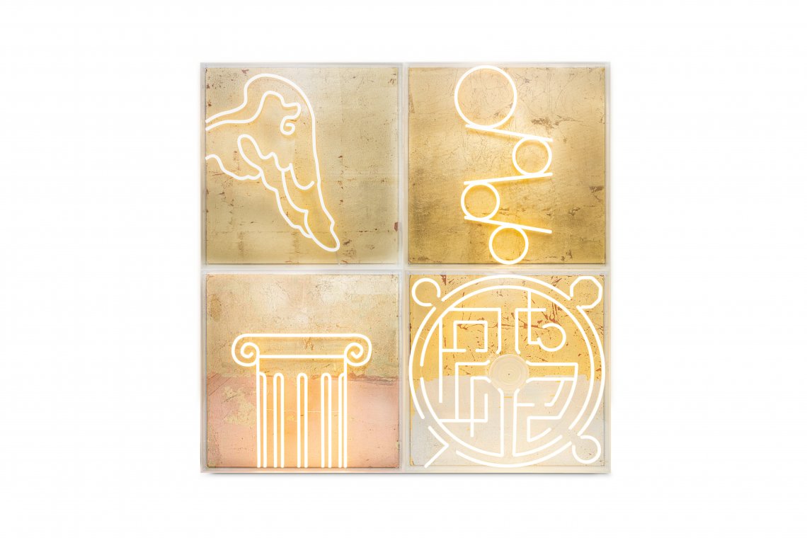 La foglia oro si contrappone al neon e al plexiglas evocando un senso di meditazione e sorpresa.