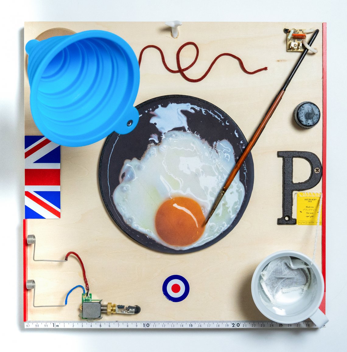 This is a music-themed artwork created by arranging junk parts, national flags, typography, and other everyday objects on a wooden panel to resemble a record player.