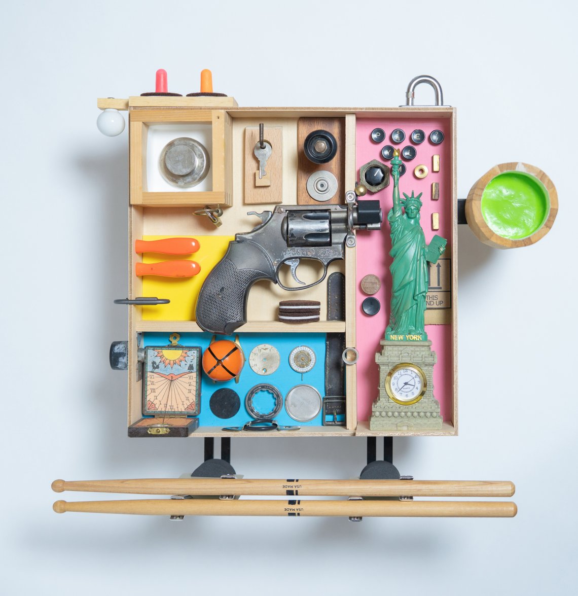 This is a bento box made from junk parts, acrylic paint, wood, souvenirs, a clock, a sundial, a toy gun, and other everyday items.