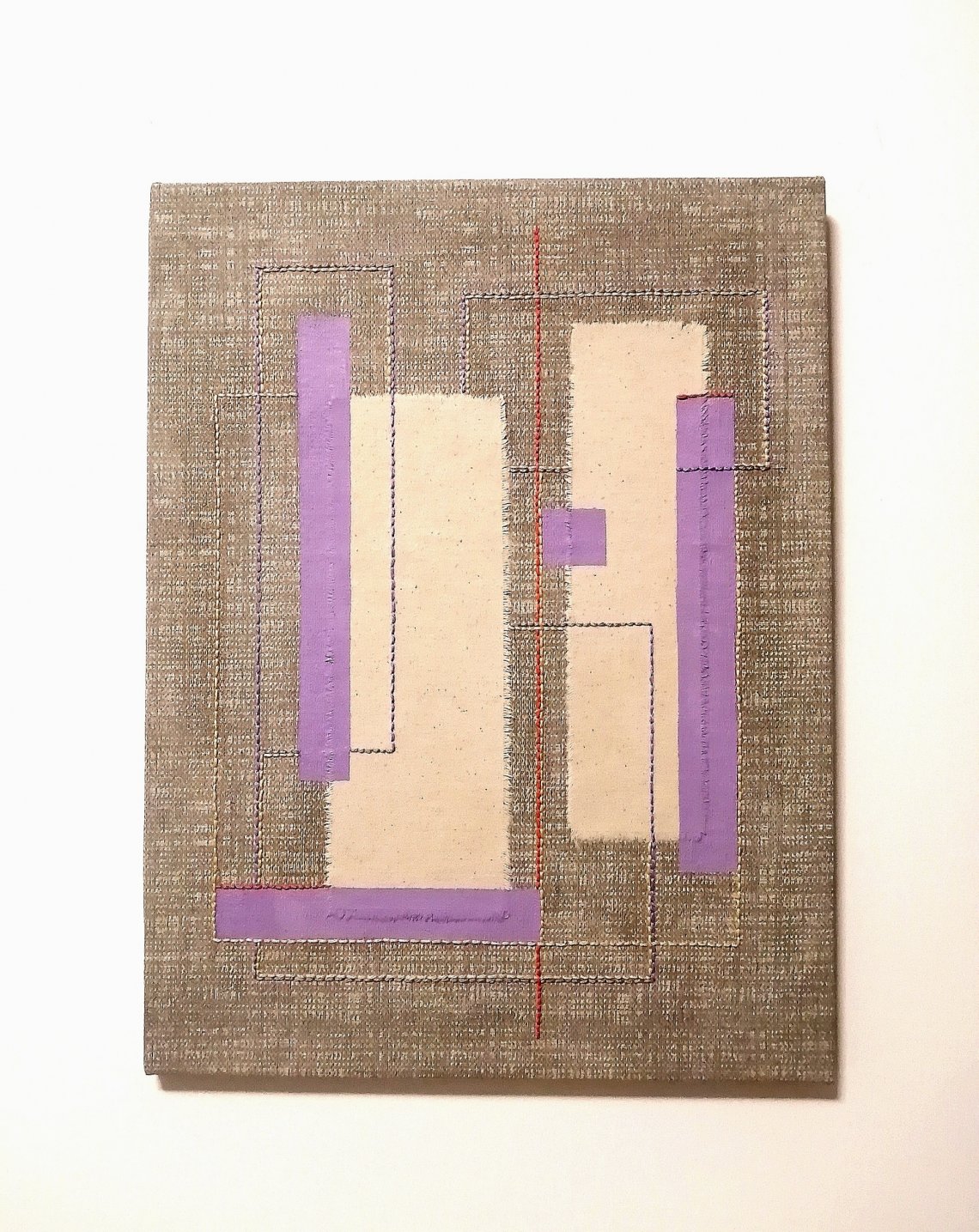 tela di cotone grezzo con interventi di pittura ad olio, college di altro tessuto e ricamo fatto a mano dall'artista.