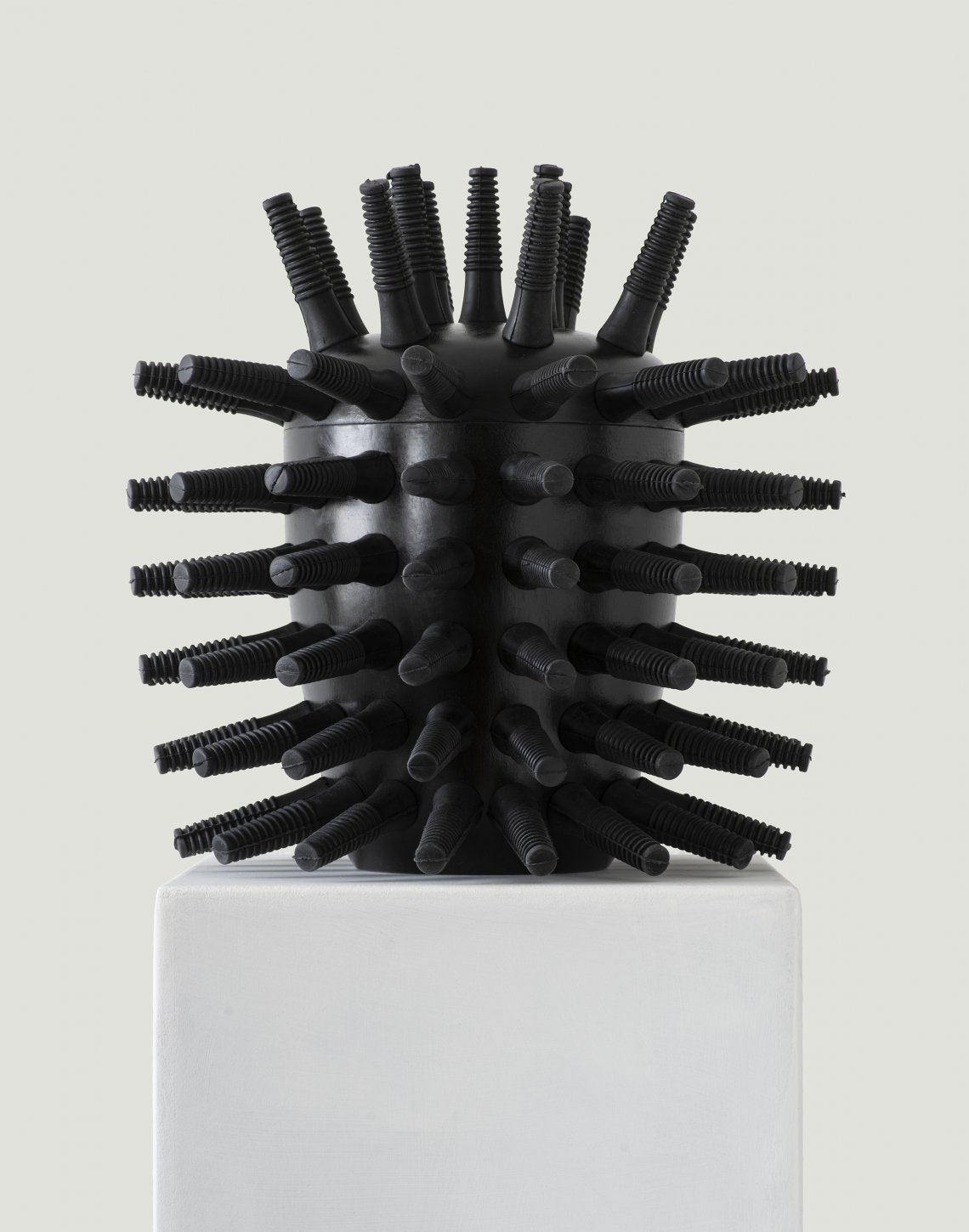 Assemblage consisting of a black cremation urn fitted with rubber "fingers" sourced from an industrial poultry plucking machine. The "fingers" are inserted directly into the body of the urn and protrude outward on all sides.