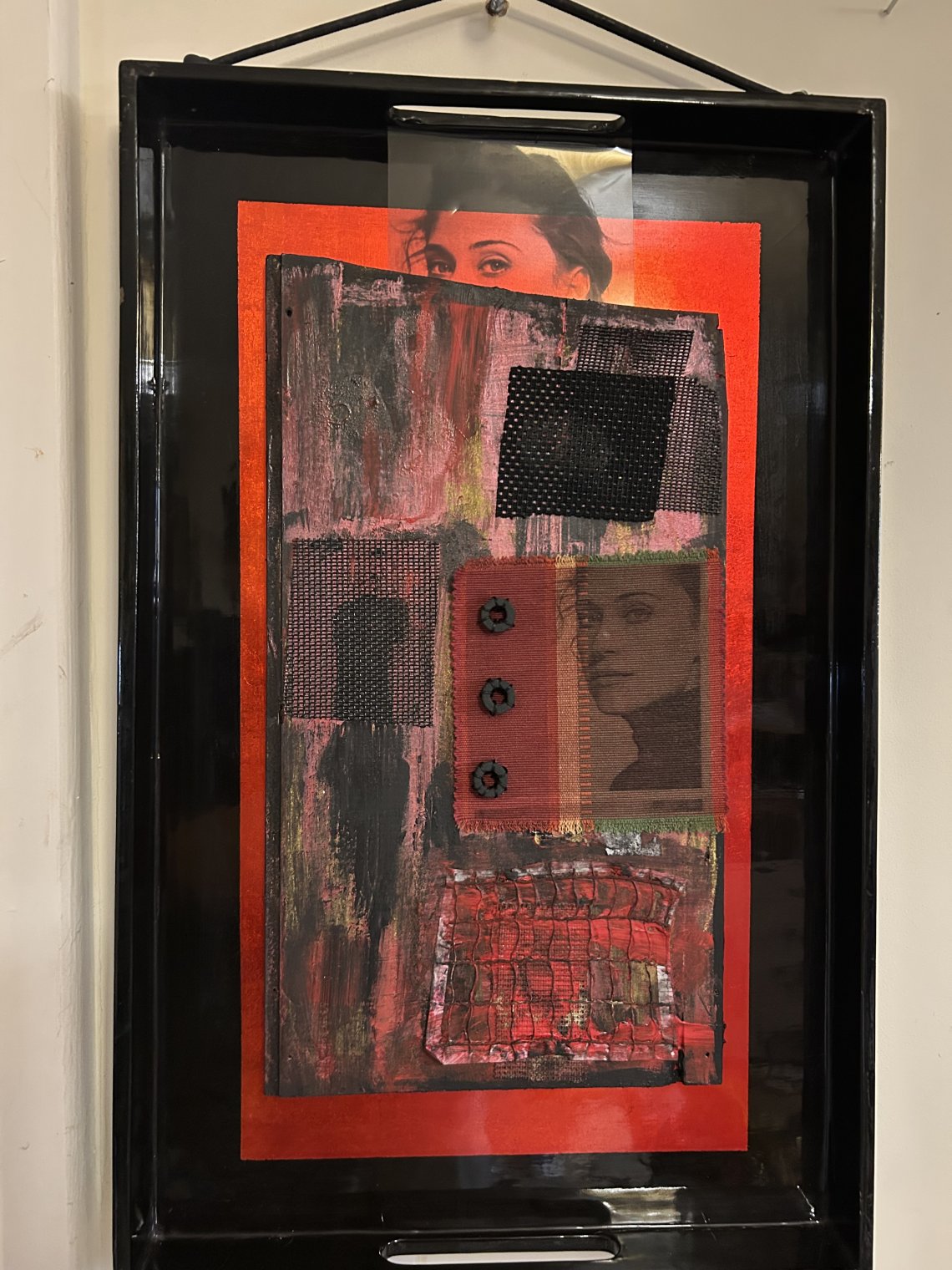 Mixed media art with abstract painting on a wooden tray and textile swatches.
