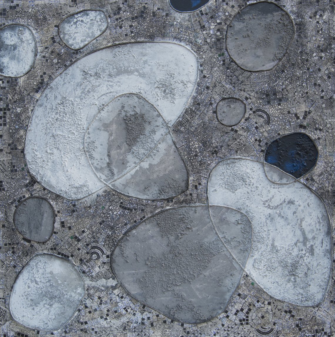 In Slide, come nei vetrini da laboratorio, la superficie diventa campo di osservazione: uno spazio in cui la materia si rivela e si trasforma. Le forme tondeggianti, costituite da calce e cemento, emergono dal fondo di tessere di parole crociate come cellule in sospensione. La loro consistenza varia ora granulosa, ora fine e il contorno, definito da un filo di lana grigio, ne sottolinea la tensione tra struttura e fragilità.