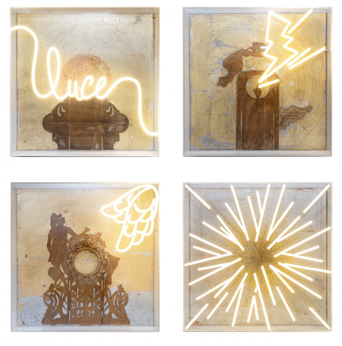 Quest' opera ispirata al mito di Dedalo e Icaro, quest' opera è realizzata in 4 pannelli led luminosi e foglia oro.