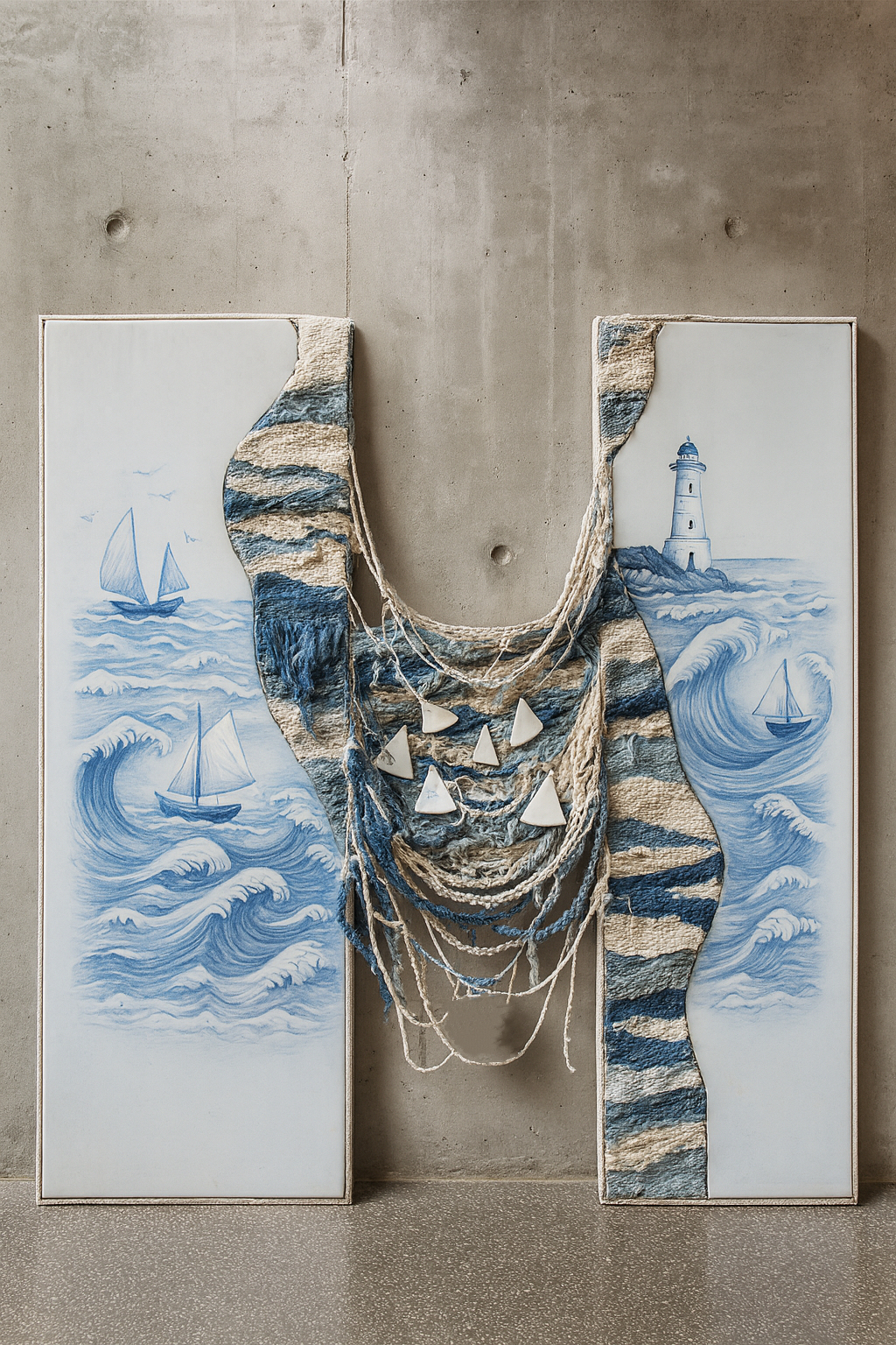 of waiting, hope, and uncertainty, while the lighthouse in the ceramic panel symbolizes guidance and