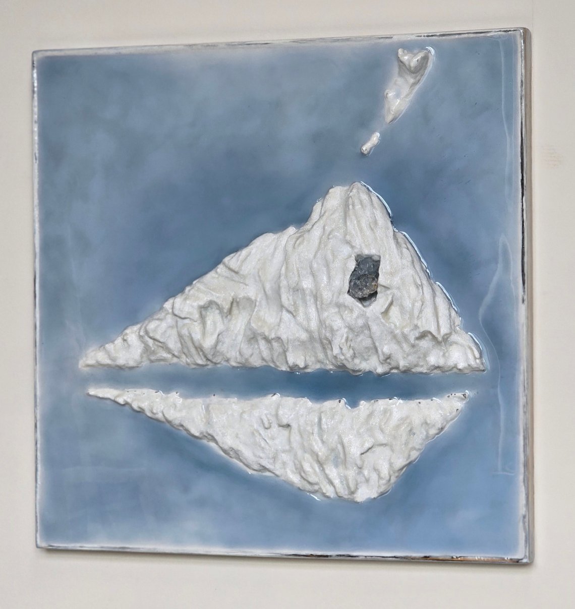 Temporarily Sleeping presents a serene, sculptural landscape suspended between stillness and awakening. The work depicts a white, mountain-like form mirrored in soft blue resin - a floating fragment of land or an iceberg adrift in calm water. A single Celestite stone rests within the upper relief, glowing faintly like a heartbeat beneath ice. The smooth, glasslike surface amplifies the sense of quietness and isolation, inviting the viewer into a contemplative pause.