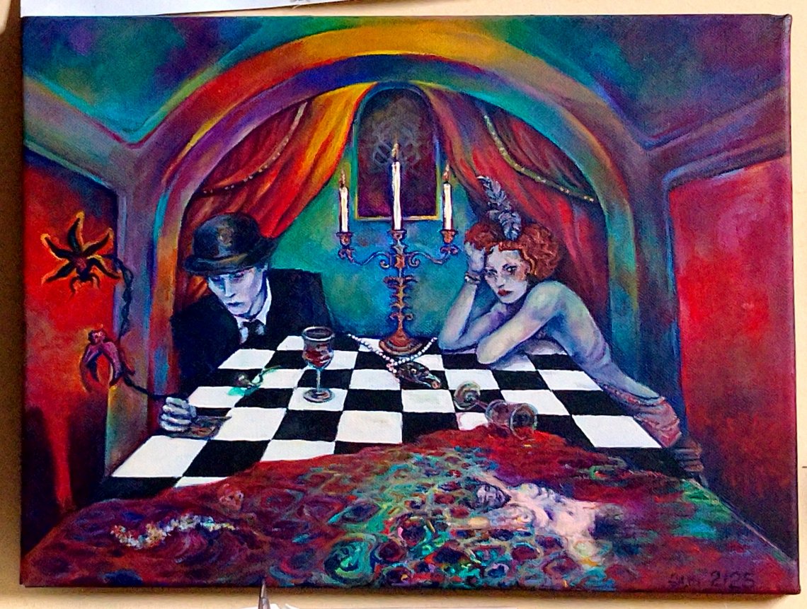 Quest'opera è un indagine sul momento presente e sulla sua misteriosa composizione di colori, vibrazioni, sentimenti, e atti rivelatori. All'interno di questa ambientazione surrealistica e teatrale sono presenti due personaggi che dominano la scena.Il primo, un poeta "maledetto" che scrive tramite il fiore che assorbe il male (orchidea nera) tanto preso dalla sua creazione da perdersi la rivelazione avvenuta in quel attimo preciso.Sul tavolo sono presenti due calici di vino, che profuma in realtà si sangue, uno dei due si rovescia in una rivelazione esistenziale, dell essenza senza ritmo, di vita desiderio e morte nello stesso istante.La sola ad accorgersene e la donna sulla sinistra, consapevole dell attimo e di ogni suo dettaglio,presente respira i colori di questo teatro dell'assurdo che si rivela attimo di vita.