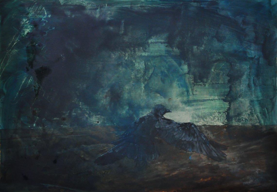 Tecnica di olio diluito con acquaragia su tela ,rappresenta un corvo che vola nell'belmezzo di una tempesta in lontananza una luce di salvezza fuori dall'oscurita .
