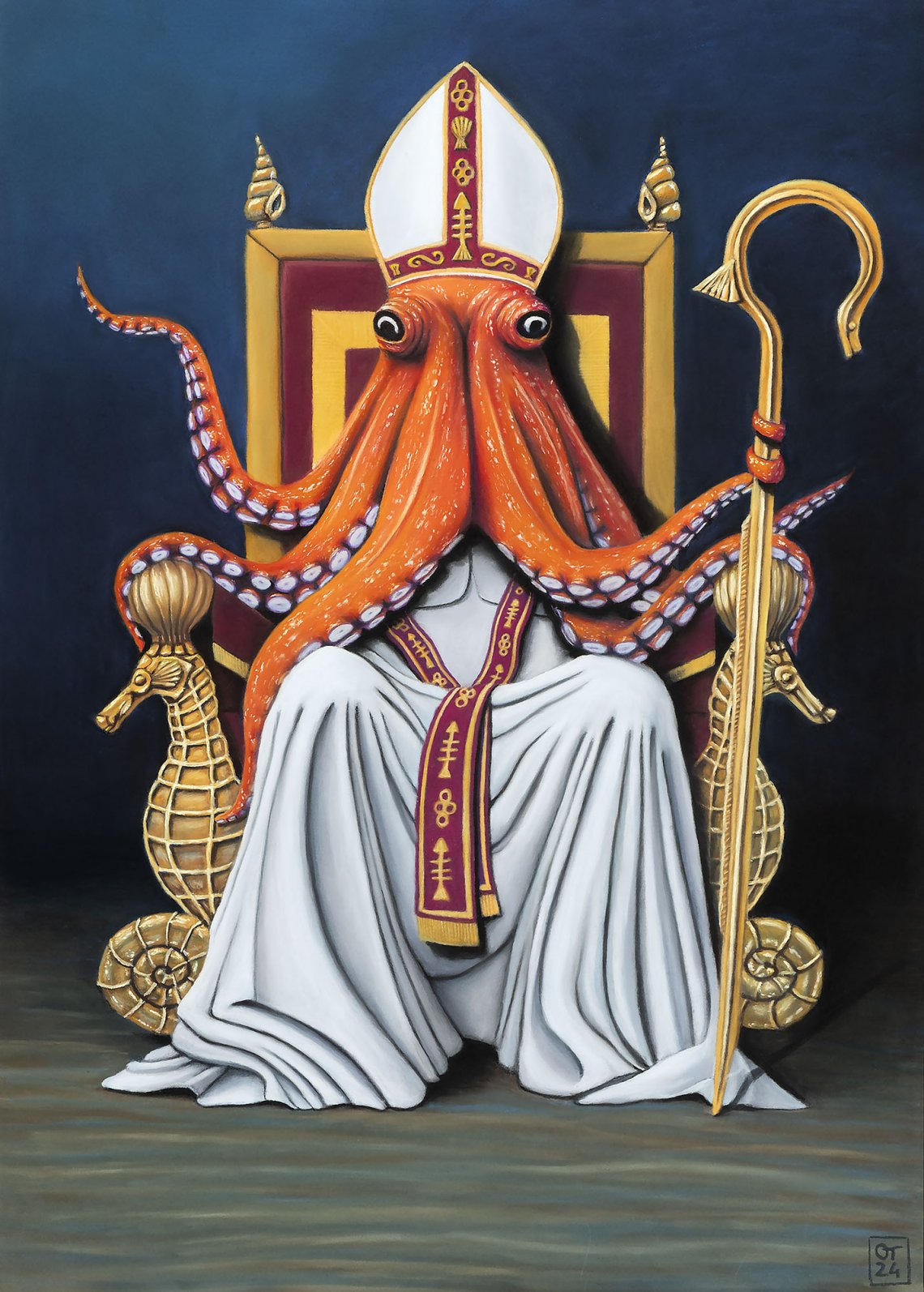 Ho immaginato il mio Papa degli abissi con un'imponenza degna delle statue papali nei Musei Capitolini. Lo volevo opulento, a simboleggiare l'istituzione che rappresenta, seduto su un trono d'oro dalla forma grottesca, che mantenesse una continuità con il tema marino. Per il suo pastorale, un pesce spatola di passaggio è stato prontamente piegato e rivestito d'oro. Ed eccolo completo: ora manca solo un tentacolo che si alza pigramente nella corrente marina per offrirti la sua benedizione.