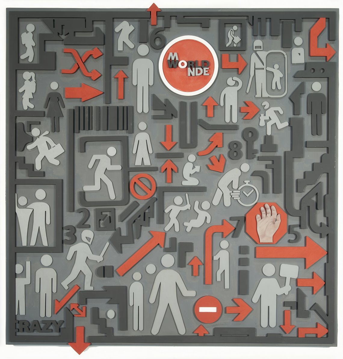 The piece assembles painted wooden fragments to create a fractured map in relief evoking contemporary experience. Through its stratified surface and changing perspectives, the work reflects a world in tension, where signs, structures and emotions collide.