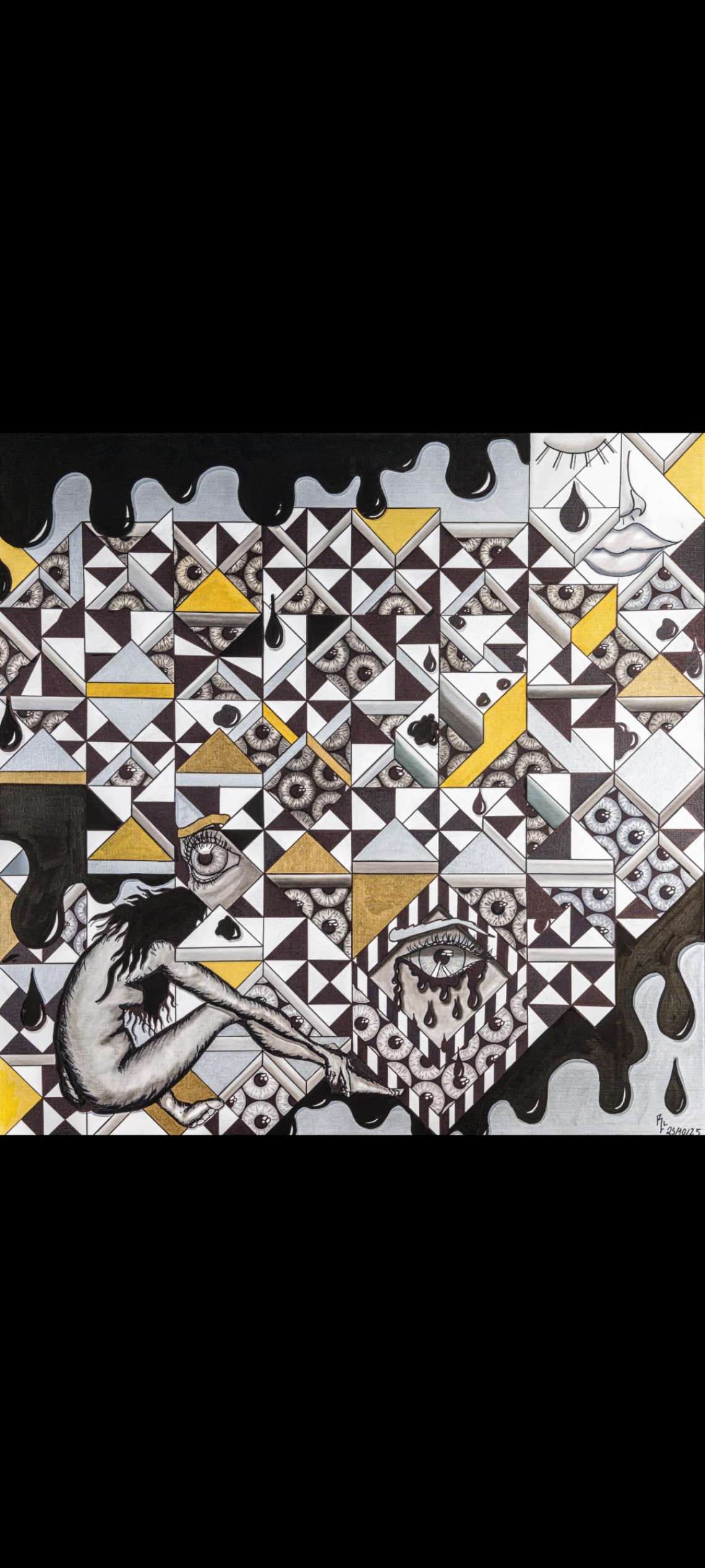 "Sono caduta dalle scale" - Rico Lipsticks Tecnica mista su tela 100x100 cm (acrilico e acquerello) con dettagli in oro e argento Un'opera intensa e simbolica sul tema della violenza sulle donne Gli occhi, moltiplicati e attenti, raccontano il dolore nascosto dietro il silenzio. Le lacrime nere diventano ferite e memoria, mentre i riflessi dorati e argentati aprono spiragli di luce, forza e rinascita. Un contrasto di geometrie perfette e emozione cruda, che trasforma la sofferenza in arte.